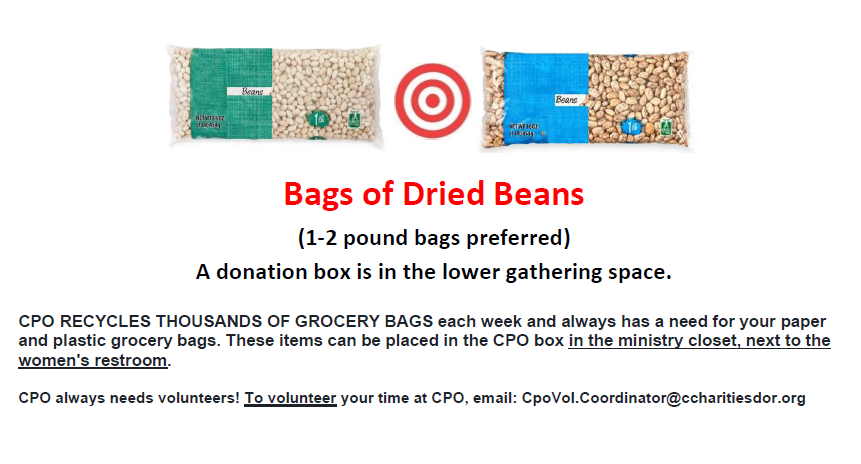 CPO is always in need of new and lightly used BABY CLOTHES—sizes 2T-6T & diapers. New and freshly laundered items can be placed in the CPO box in the ministry closet, next to the women’s restroom.